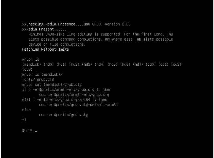 The Gigabyte server R292-P92 can not boot Ubuntu Jammy 22.04 via PXE boot under MAAS control. When PXE boot happens I see that IP address gets assigned and server receives two files bootaa64.efi and grubaa64.efi via TFTP. But after that the boot process stops and the console shows that the server drops to the GRUB shell.