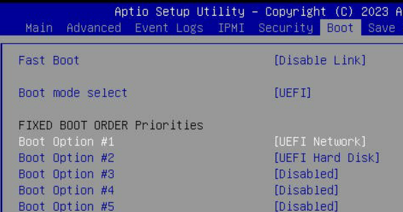 I don’t seem to have a “UEFI PXE” boot option. So, I tried setting the first option to the closest thing I could find to that, which I think would be “UEFI Network”: