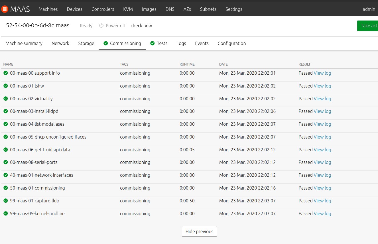 Commissioning logs, which are presented on the “Commissioning” tab for any machine in the “Ready” state, contain a list of commissioning scripts with a timestamp and result. You can view the detailed logs for each of these scripts from this tab.