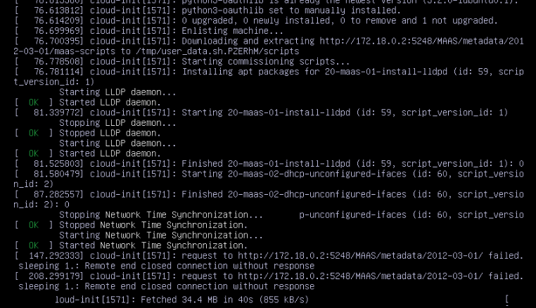 I have a machine (Minisforum MS-01) is able to be discovered but fails to commission. The failure is odd. I have attached a screenshot from the remote KVM but it seems to download the scripts just fine but appears to timeout during the 20-maas-02-dhcp-unconfigured-ifaces script. I have tried many network combinations to see if it is a certain config that is causing problems. When I browse to that URL I am able to get the response back no problem.