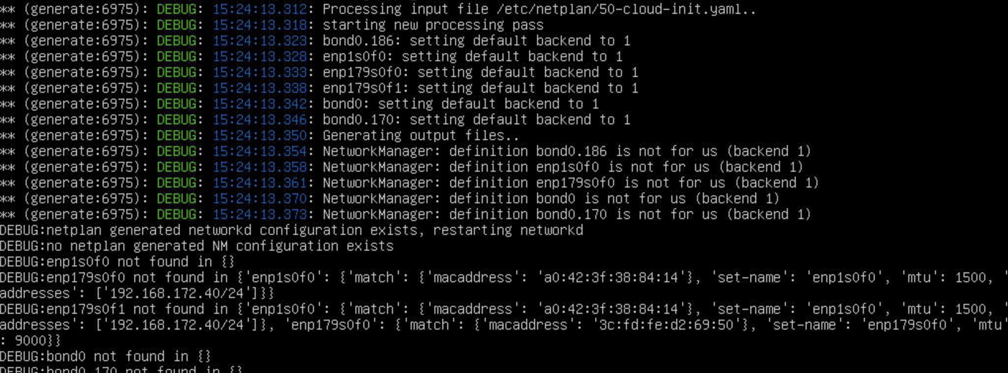 DEBUG:enp179s0f0 not found in {‘enp1s0f0’: {‘match’: {‘macaddress’: ‘a0:42:3f:38:84:14’}, ‘set-name’: ‘enp1s0f0’, ‘mtu’: 1500, ‘addresses’: [‘192.168.172.40/24’]}}