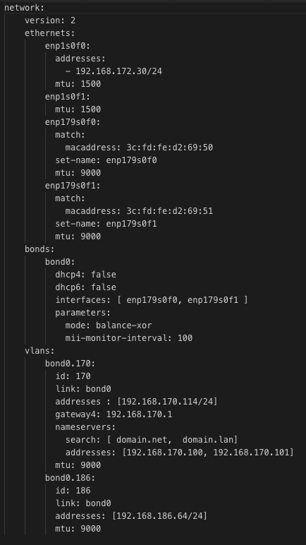 DEBUG:bond0.186 not found in {‘bond0.170’: {‘id’: 170, ‘link’: ‘bond0’, ‘addresses’: [‘192.168.170.114/24’], ‘gateway4’: ‘192.168.170.1’, ‘nameservers’: {‘search’: [’ domain.net’, ’ domain.lan’], ‘addresses’: [‘192.168.170.100’, ‘192.168.170.101’]}, ‘mtu’: 9000}}
