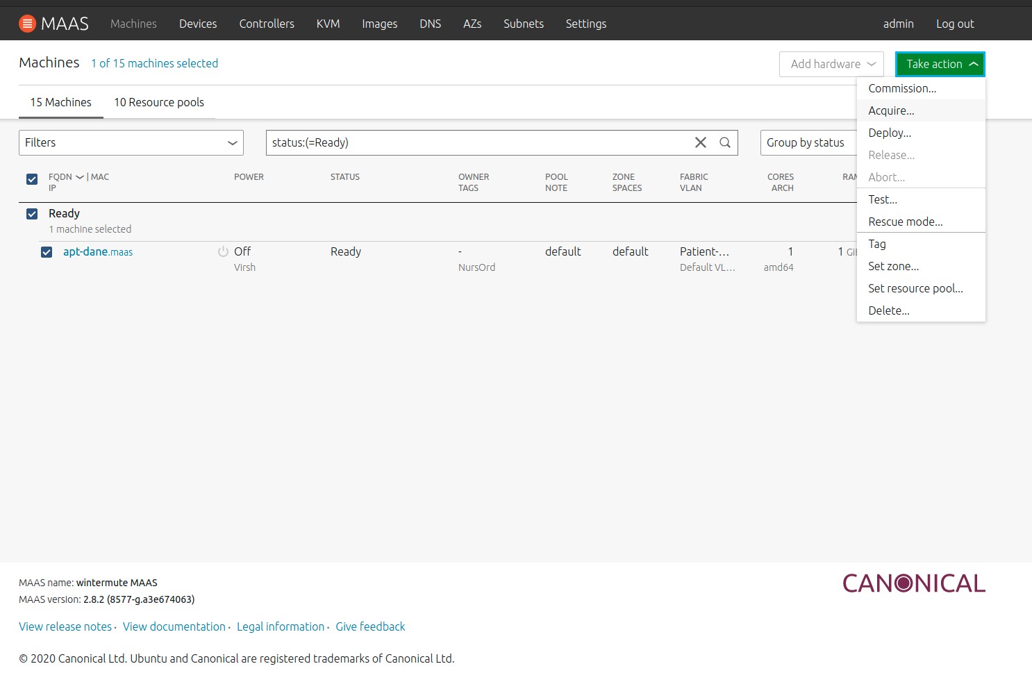 To acquire/allocate a node with the web UI, select a machine which is in the “Ready” state, and drop down the “Take action” menu: