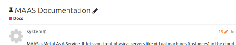 Once this new system is live, each page of documentation under maas.io/docs will have a link at the bottom saying “Help improve this document in the forum”. This link will take you to the Discourse topic containing the content for that page, which in most cases can be directly edited by any member of this Discourse community. Or alternatively, comments can be added below that topic to discuss any change to the topic post itself.
