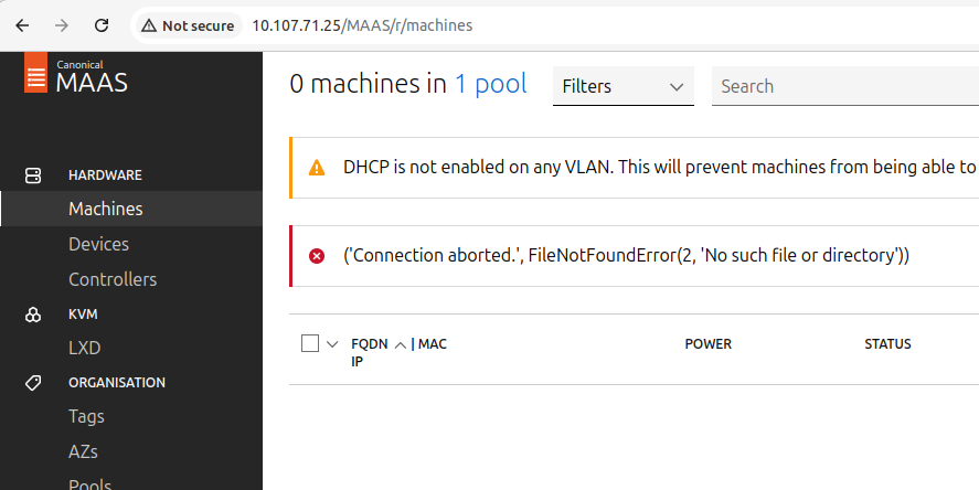 When we access the “machines” interface, an error is raised: “(‘Connection aborted.’, FileNotFoundError(2, ‘No such file or directory’))”.
