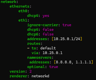 I have a VM in HyperV, Ubuntu 24.04, with one network interface. It gets DHCP from my Fortigate and gets 10.20.0.42.