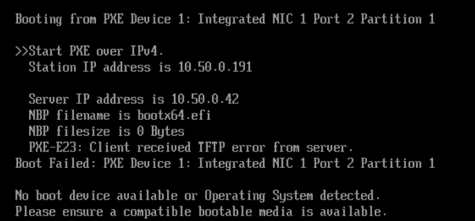 If I set up a new interface with static IP 10.50.0.2, which is NOT a DHCP server in my Fortigate, I still can’t get PXE boot working because its only enable on interface 1 (10.20.0.42) and I can’t set up a DHCP server on that interface.