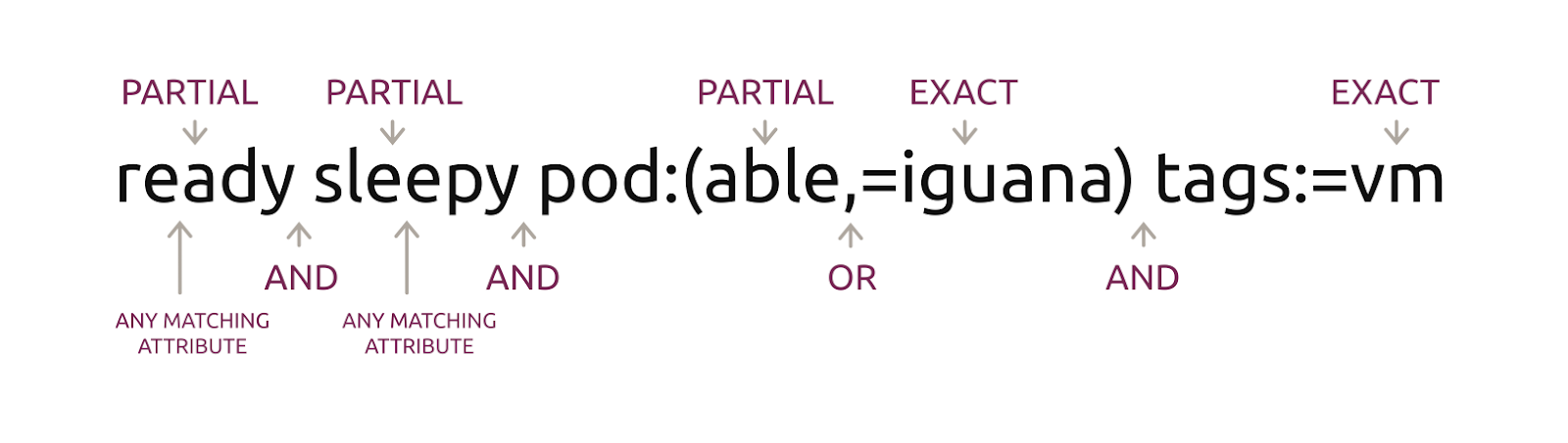 MAAS uses ‘AND’ logic by default for multiple terms. For instance, pod:able,cattle cpu:=5 will show machines in pods named able or cattle with 5 CPU cores.