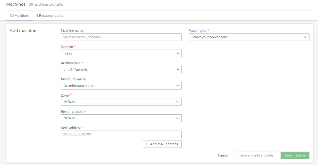 $POWER_TYPE: You must select the power type supported by the machine you are adding, and fill in additional required fields that appear. See Power management reference for details on the available power types and the relevant parameters for each type. In this example, we’ve used a “virsh” power type (a libvirt KVM), but your choice will depend on your hardware. -