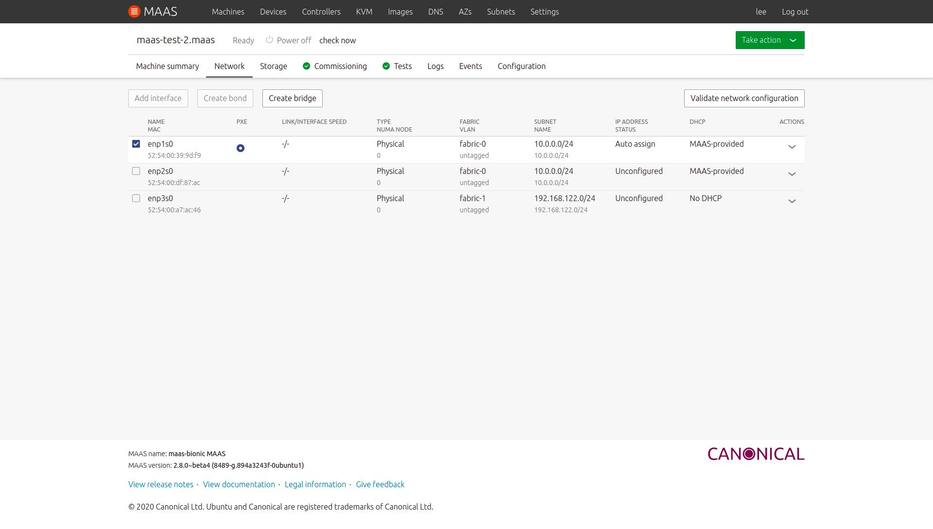 Select the interface you wish to configure the bridge on. This example uses the boot interface, since the boot interface must be connected to a MAAS controlled network – but any interface is allowed: