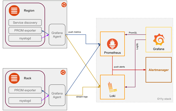 Below is a reference observability stack featuring Prometheus for metric collection and alerting, Loki for log aggregation and alerts, Grafana for visualization, Alertmanager for handling notifications, and Grafana Agent as the telemetry collector.