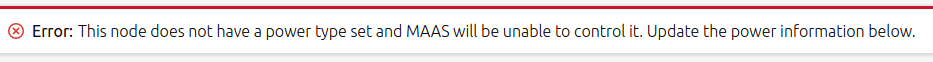 Click ‘Save changes’ to finish. Once that’s done, MAAS performs a power check on the machine. A successful power check is a good indication that MAAS can properly communicate with the machine, that is, it should quickly result in a power status of “Power off”. A failed attempt will show: