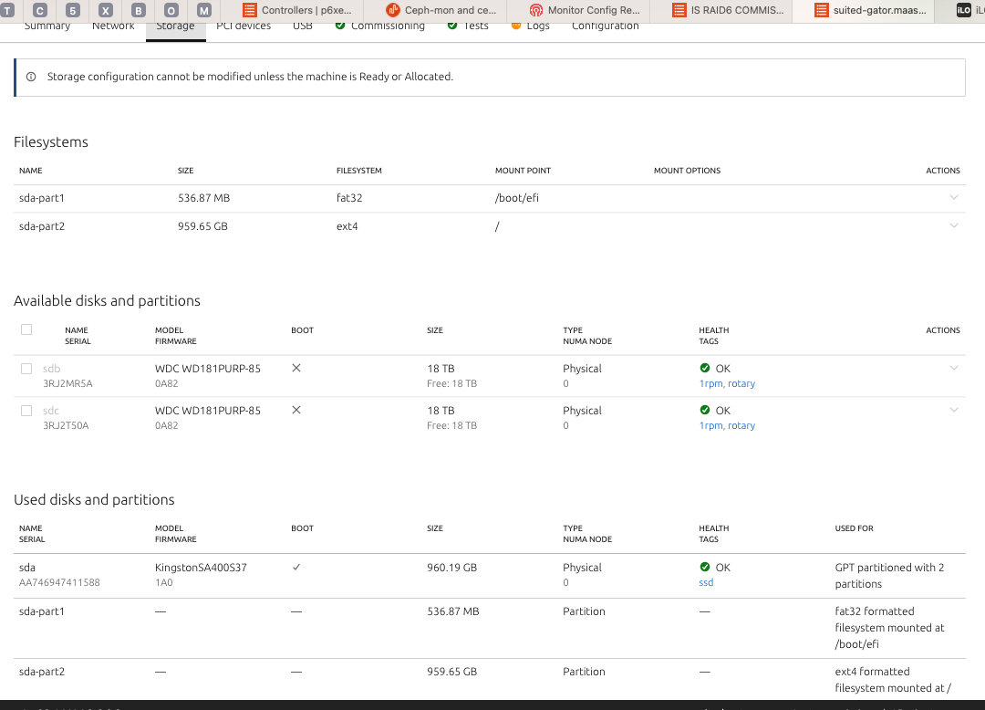 The problem is that CEPH in all installations does not accept the Storage MAAS deployment, which in my case is booting on a group of 4 hard drives in RAID6, adding up to 40T.