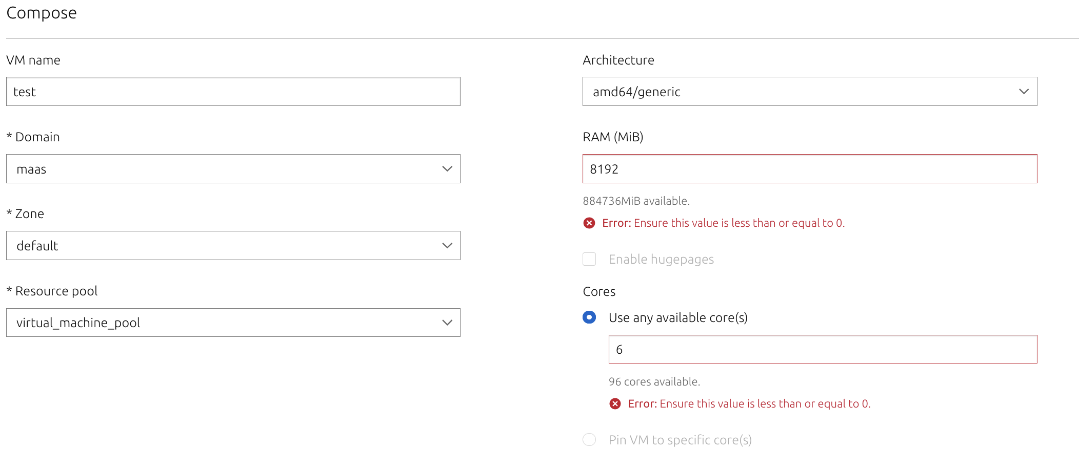 I created a fresh KVM host (Dell r710), Ubuntu 20.04 with hwe-20.04-edge kernel and set the CPU and Memory over commitment to 6.0. The server was never used before with ample storage, CPU, and RAM available and was greeted with this error: Apparently my RAM and Cores needs to be 0 to be able to deploy although I have 884736MB Ram and 96 Cores available.