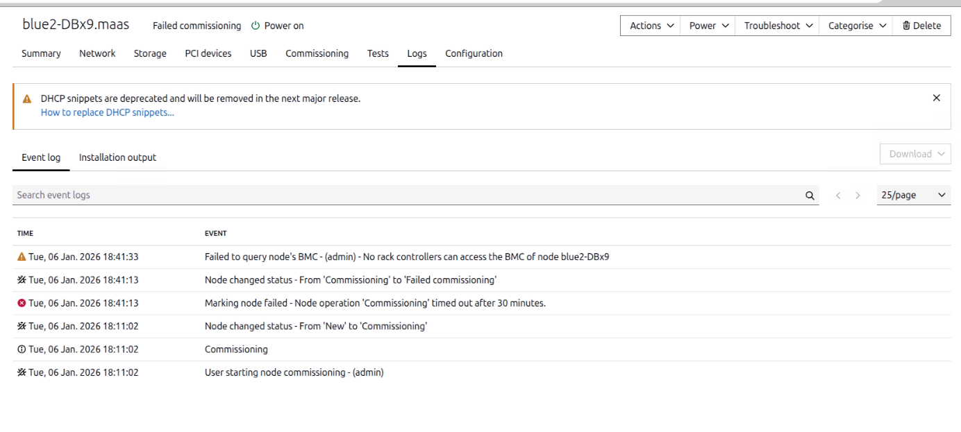 - PXE boot begins and the ephemeral commissioning environment starts, but networking becomes unstable and commissioning fails/timeouts (intermittent link / no DHCP renew / loses connectivity mid-commissioning).
