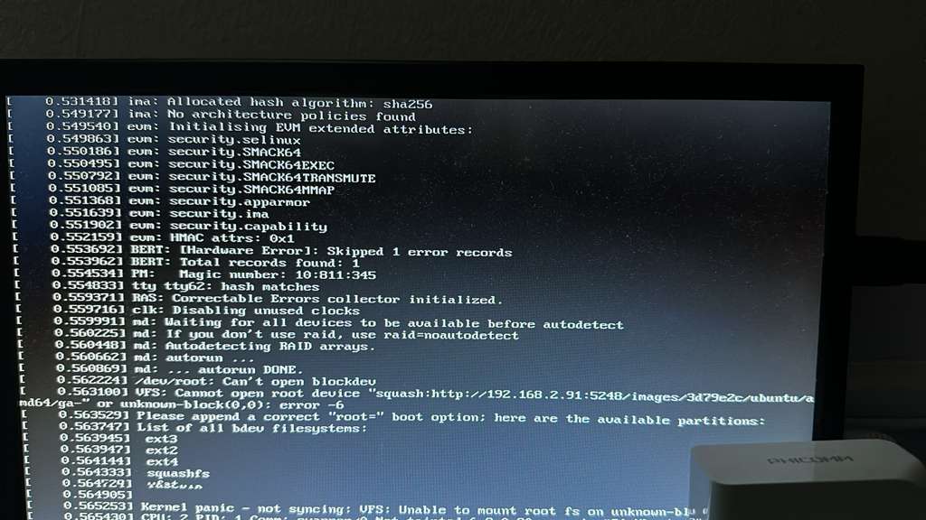 0.563100] VFS: Cannot open root device 'squash:http://192.168.2.91:5248/images/3d79e2c/ubuntu…' or unknown-block(0,0): error -6