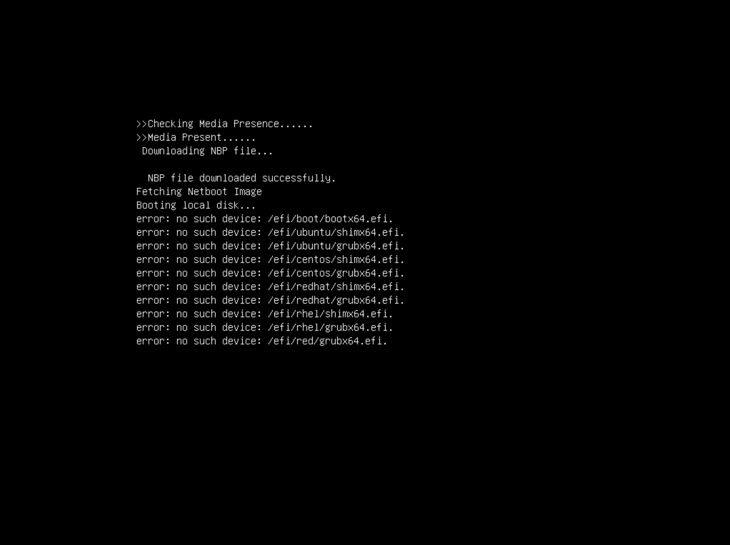 - It looks as through it deploys successfully, but afterwards it reboots, attempts to boot from disk, and shows the output below (see screenshot)