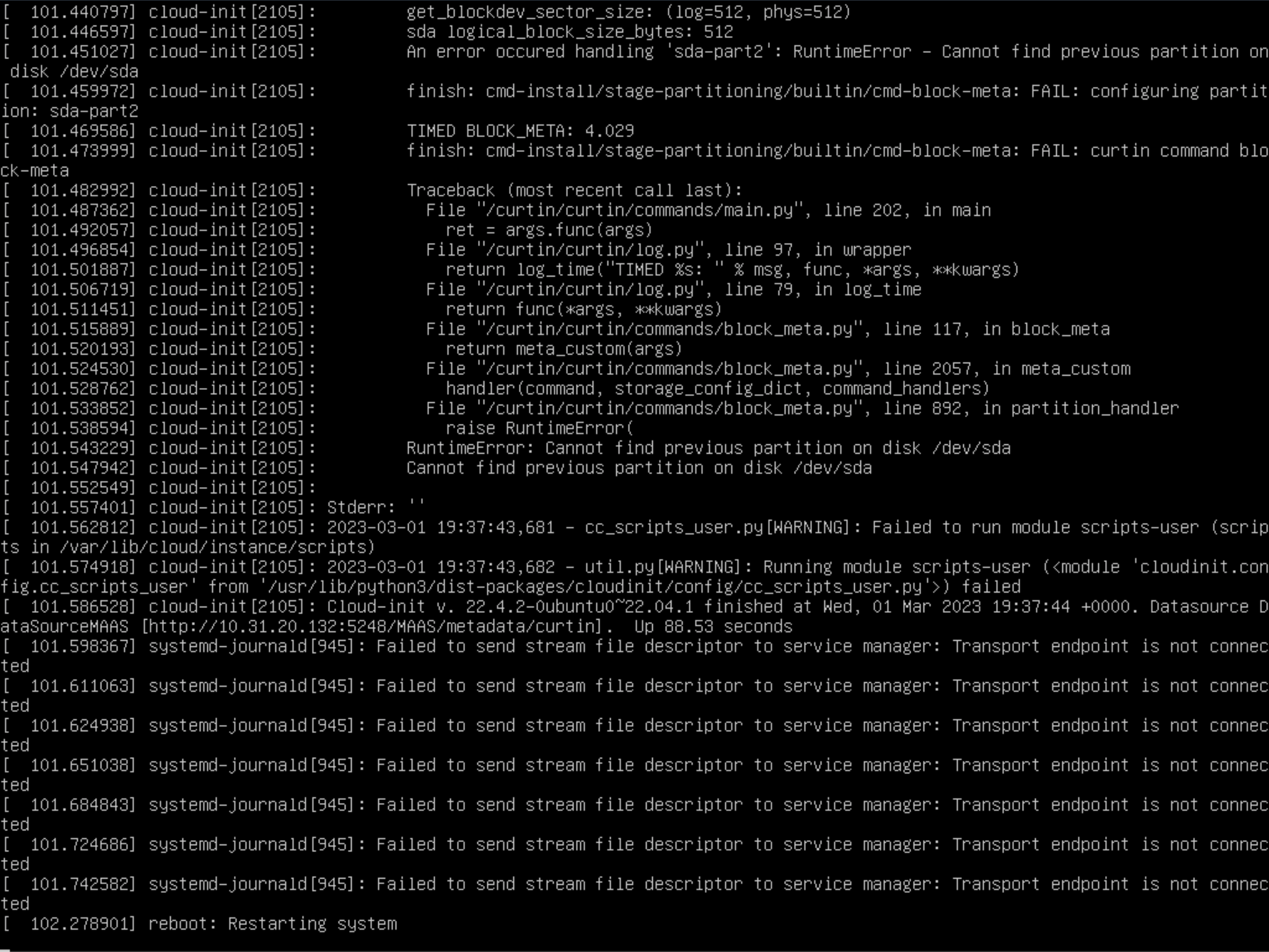We ran another test today to make sure that the problem was not related to our custom Rocky8 image that we’re attempting to deploy. Even though this image has deployed fine on Dell machines before, we ran another deployment on the Lenovo host with the Ubuntu 22.04 image in MAAS. The results were slightly different so we’re hoping this output may help shed some light on the issue. Or it may look more familiar to those who have more experience deploying Ubuntu.