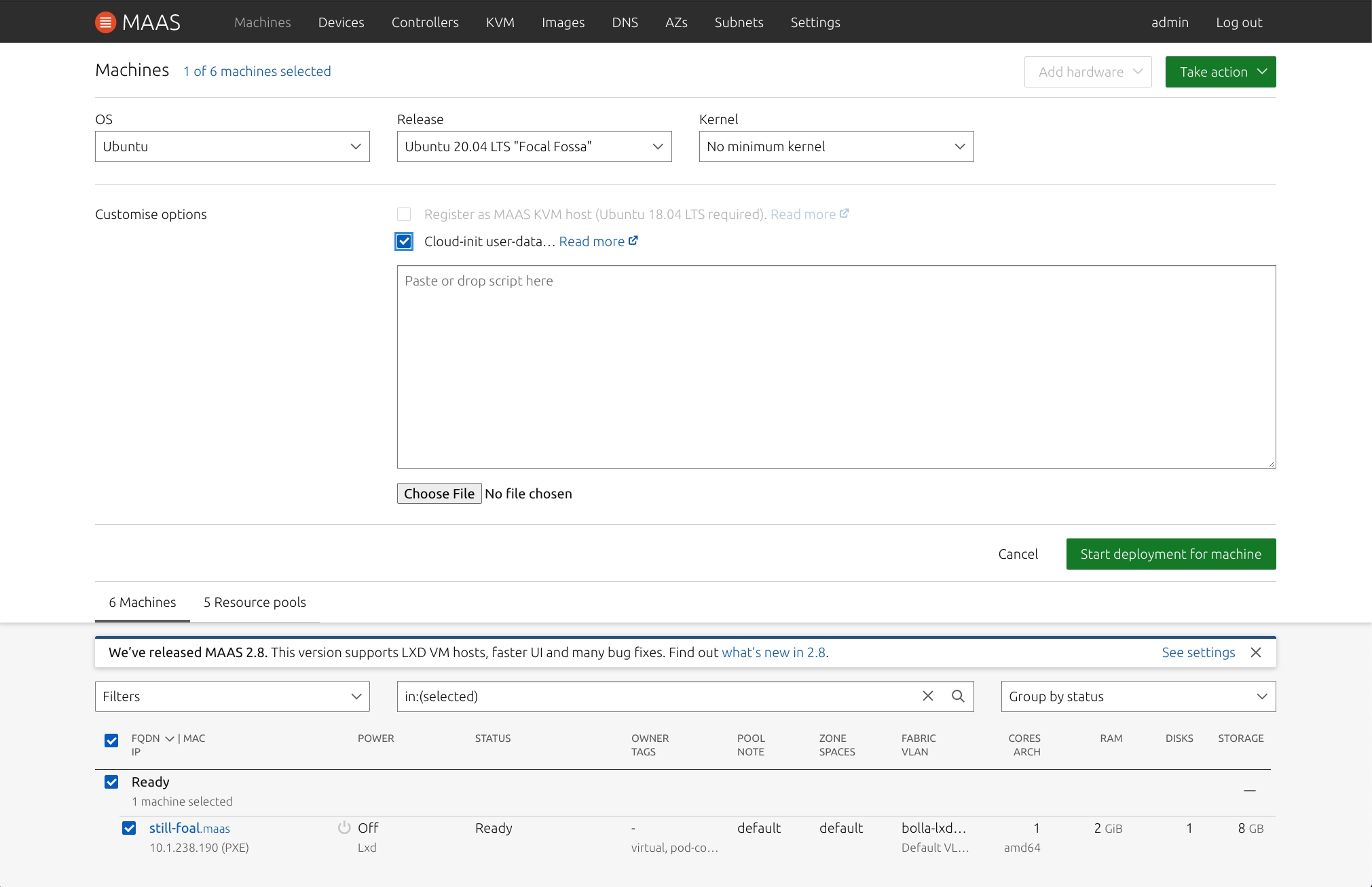 In 2.9 our deployment form will support additional cloud-init snippets for users who prefer to customise their user-data during deployment. Once you select a machine(s) for deployment, you may select the “Cloud-init user-data” checkbox or “choose file” button to import your user-data script during deployment. You may also register MAAS as KVM host at the same time. However, we currently only support Ubuntu 18.04 “Bionic Beaver” for this option.