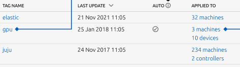 The second column of the form handles tag changes. Where you can view all tags that are assigned to the selected machines (blue), new/existing tags to be assigned to selected machines (green), the tags that you planned to remove from selected machines (red), and automatic tags (gray), which MAAS handles it’s tagging operation for your so you cannot perform manual actions here.