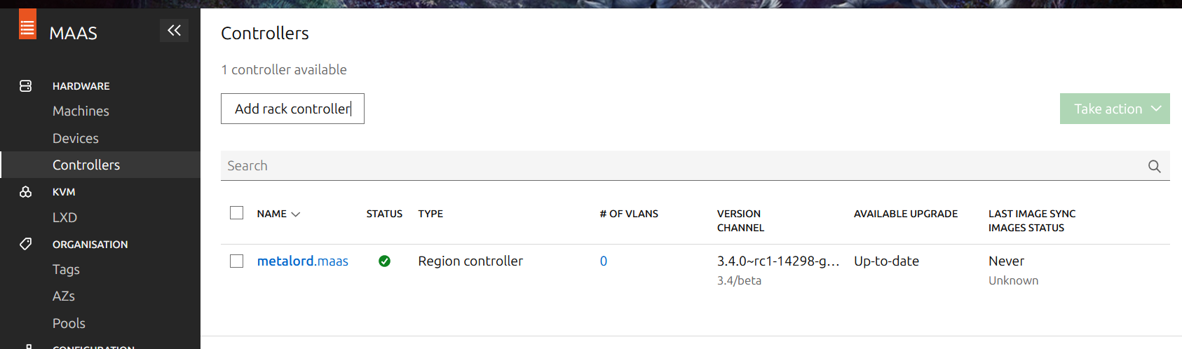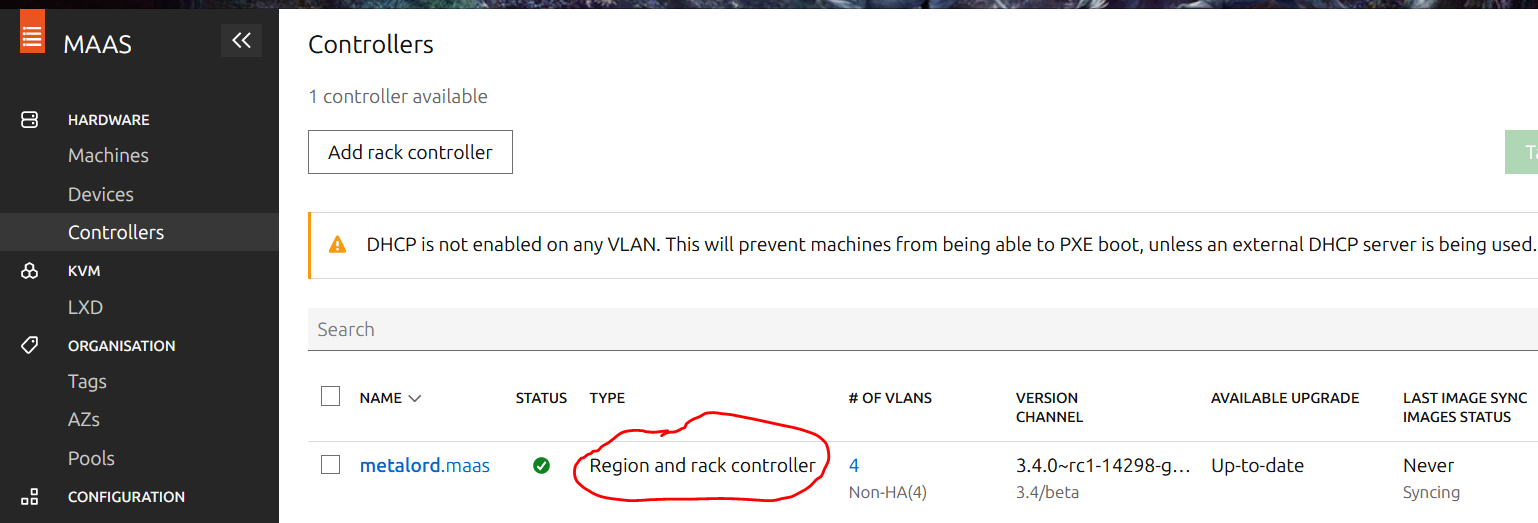 I only see a single controller in the UI, a region controller (see screenshot below). When I Add rack controller, using the commands given yields a warning/error indicating that the controller has already been initialized. So, I’m convinced that the controller exists but is just not able to communicated with its regional cousin…