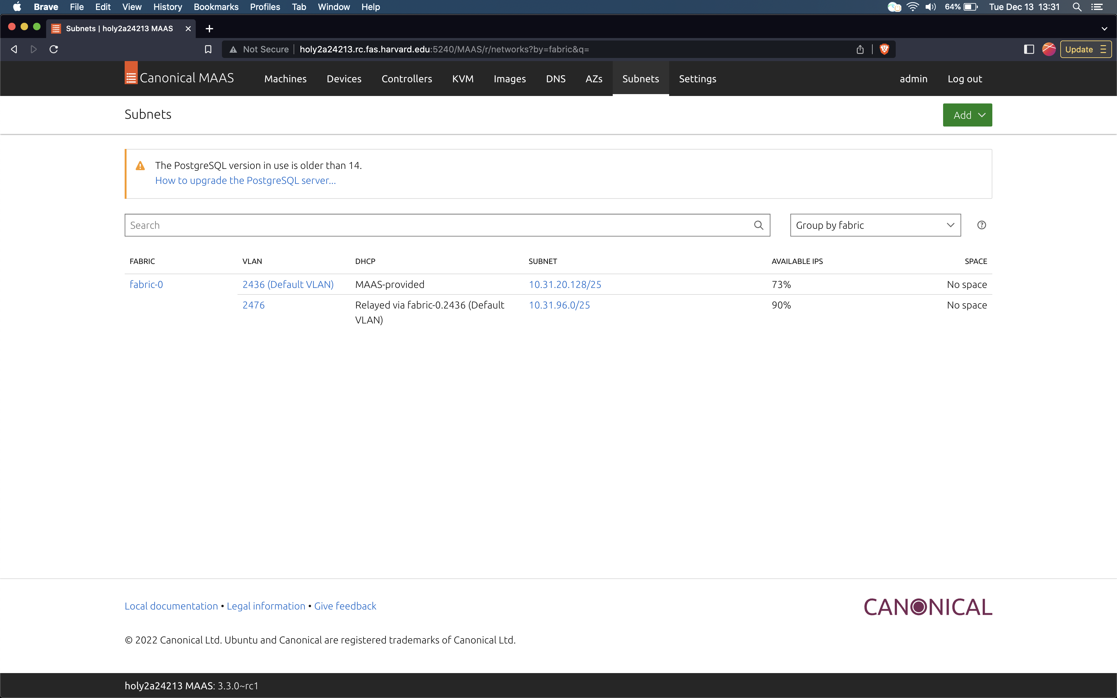 @billwear Here is the āSubnetsā tab. VLAN 2436 is where the MAAS server lives, and the nodes that it is currently deploying to are on VLAN 2476. They have their DHCP requests relayed via a helper to the MAAS server.
