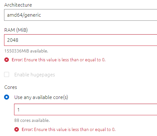 2022-02-02 17:43:09 maasserver.websockets.protocol: [critical] Error on request (108) pod.compose: {“cores”: [“Ensure this value is less than or equal to 0.”], “memory”: [“Ensure this value is less than or equal to 0.”]}