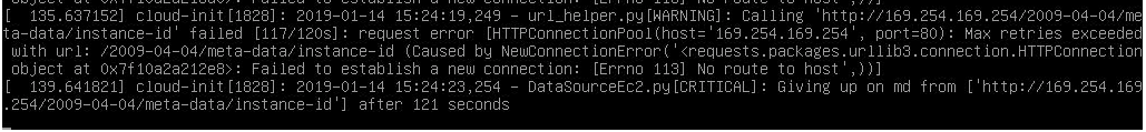 Then it reboots and it displays error messages of my last comment, without being able to connect to cloud-init datasource.