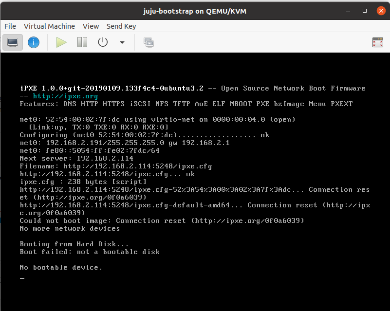 I’ve stoodup KVM+MAAS on a single server with a network bridge and MAAS providing DHCP. When I go to provision a server, PXE starts but but I get a Connection Reset error.