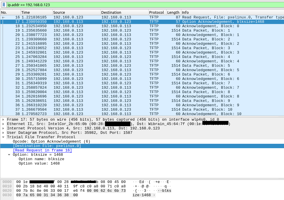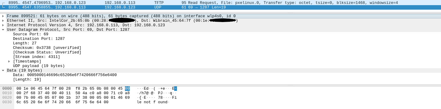 Looking at the logs I’m seeing 404 related to the pxelinux.0 which is also shown in the wireshark “file not found”.