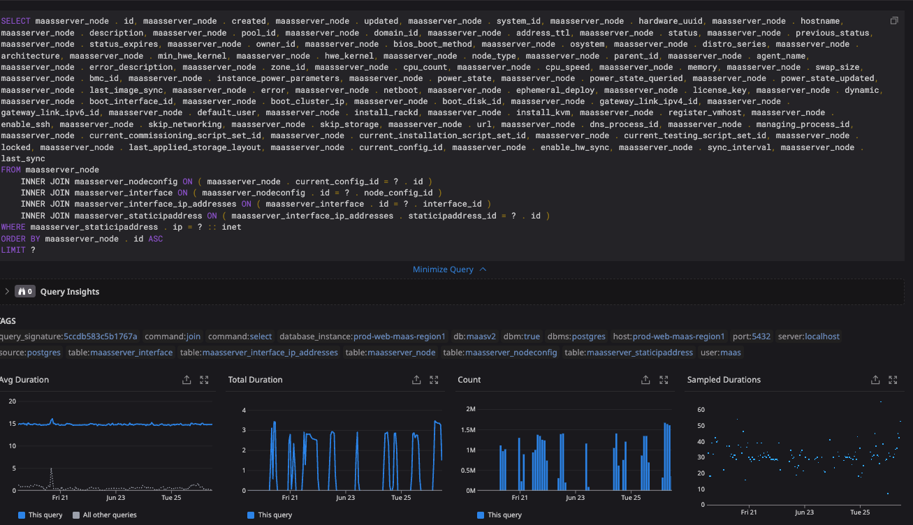 de”.“current_testing_script_set_id”, “maasserver_node”.“locked”, “maasserver_node”.“last_applied_storage_layout”, “maasserver_node”.“current_config_id”, “maasserver_node”.“enable_hw_sync”, “maasserver_node”.“sync_interval”, “maasserver_node”.“last_sync” FROM “maasserver_node” INNER JOIN “maasserver_nodeconfig” ON (“maasserver_node”.“current_config_id” = “maasserver_nodeconfig”.“id”) INNER JOIN “maasserver_interface” ON (“maasserver_nodeconfig”.“id” = “maasserver_interface”.“node_config_id”) INNER JOIN “maasserver_interface_ip_addresses” ON (“maasserver_interface”.“id” = “maasserver_interface_ip_addresses”.“interface_id”) INNER JOIN “maasserver_staticipaddress” ON (“maasserver_interface_ip_addresses”.“staticipaddress_id” = “maasserver_staticipaddress”.“id”) WHERE “maasserver_staticipaddress”.“ip” = ‘45.195.251.12’::inet ORDER BY “maasserver_node”.“id” ASC LIMIT 1 | 2024-06-26 12:17:00.481874+00 | 2024-06-26 12:17:00.481875+00