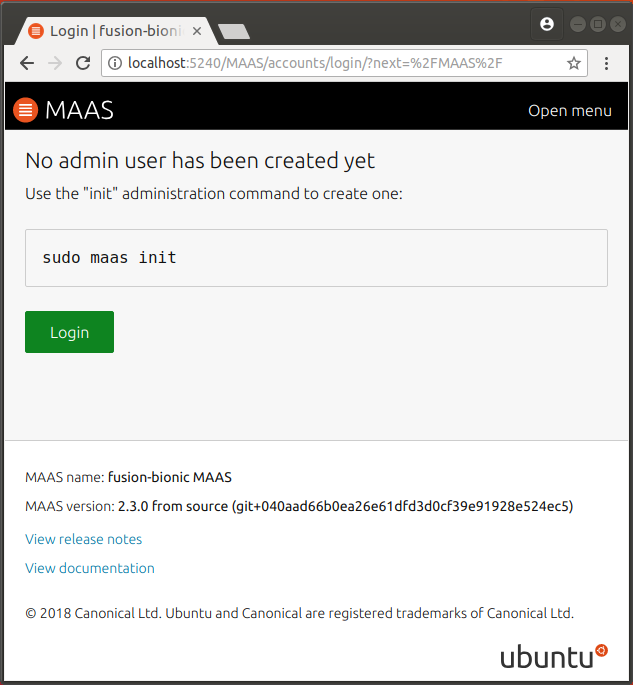 After that, you should be able to browse to http://localhost:5240/MAAS/ and log into the Web UI (replace localhost with the IP address of the MAAS server if it isn’t running on your local machine, such as in a container or VM).