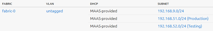 Here are my subnets within MAAS. The goal is to have 1-2 rack controllers controlling 256 nodes, across about 16 subnets or so.