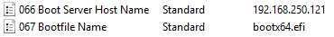 TFTP Boot File should be either “bootx64.efi” for x86_64 UEFI or “lpxelinux.0” for x86_64 legacy BIOS.