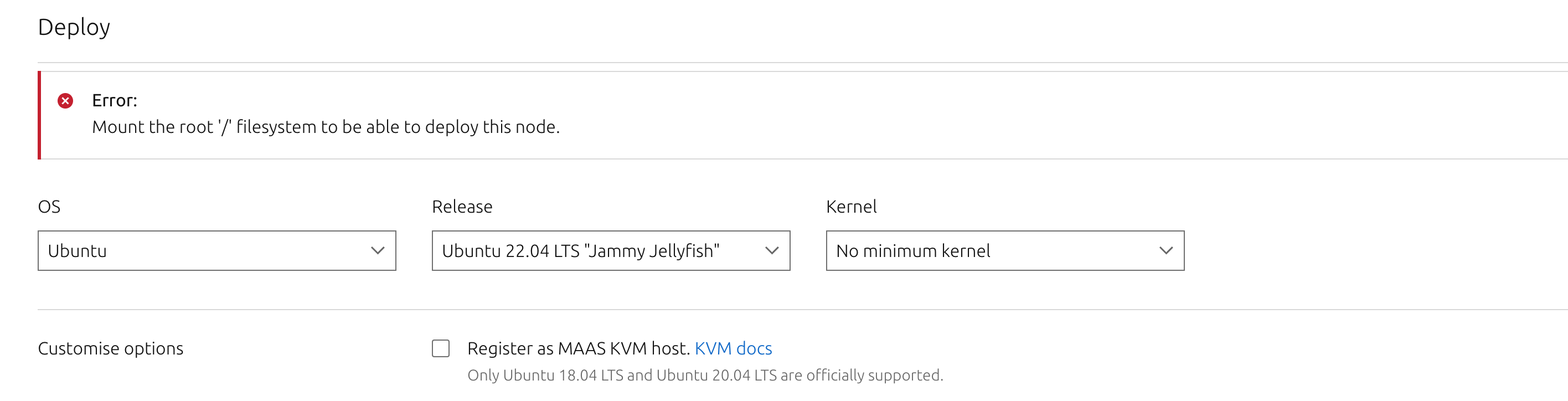 However, when I try to Deploy the node, it immediately throws an error that says Error: Mount the root '/' filesystem to be able to deploy this node
