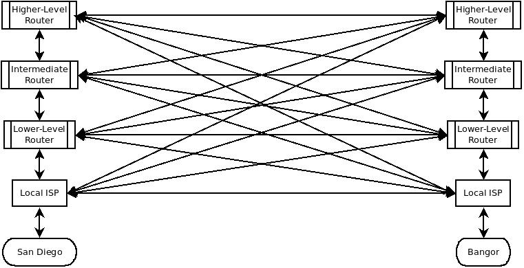 The Internet is theoretically survivable because every computer can connect to every other computer. That’s not standard operating procedure. High-level networks (Network Service Providers, NSPs) connect to at least three top level nodes called Network Access Points (NAPs), aka Internet Exchange Points. At these points, packets to jump from one NSP to another. NAPs are public access points, Metropolitan Area Exchanges are private. These are virtually indistinguishable for the purposes of this discussion.