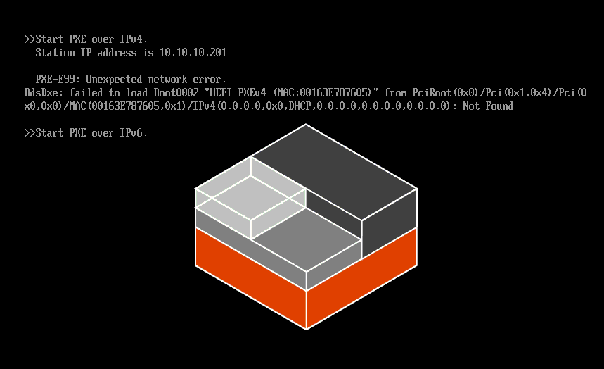 That IPv4(0.0.0.0…) bit looks very suspicious. Some conversation with DHCP server must have happened because PXE got an IP address, but the boot details seem to be missing.