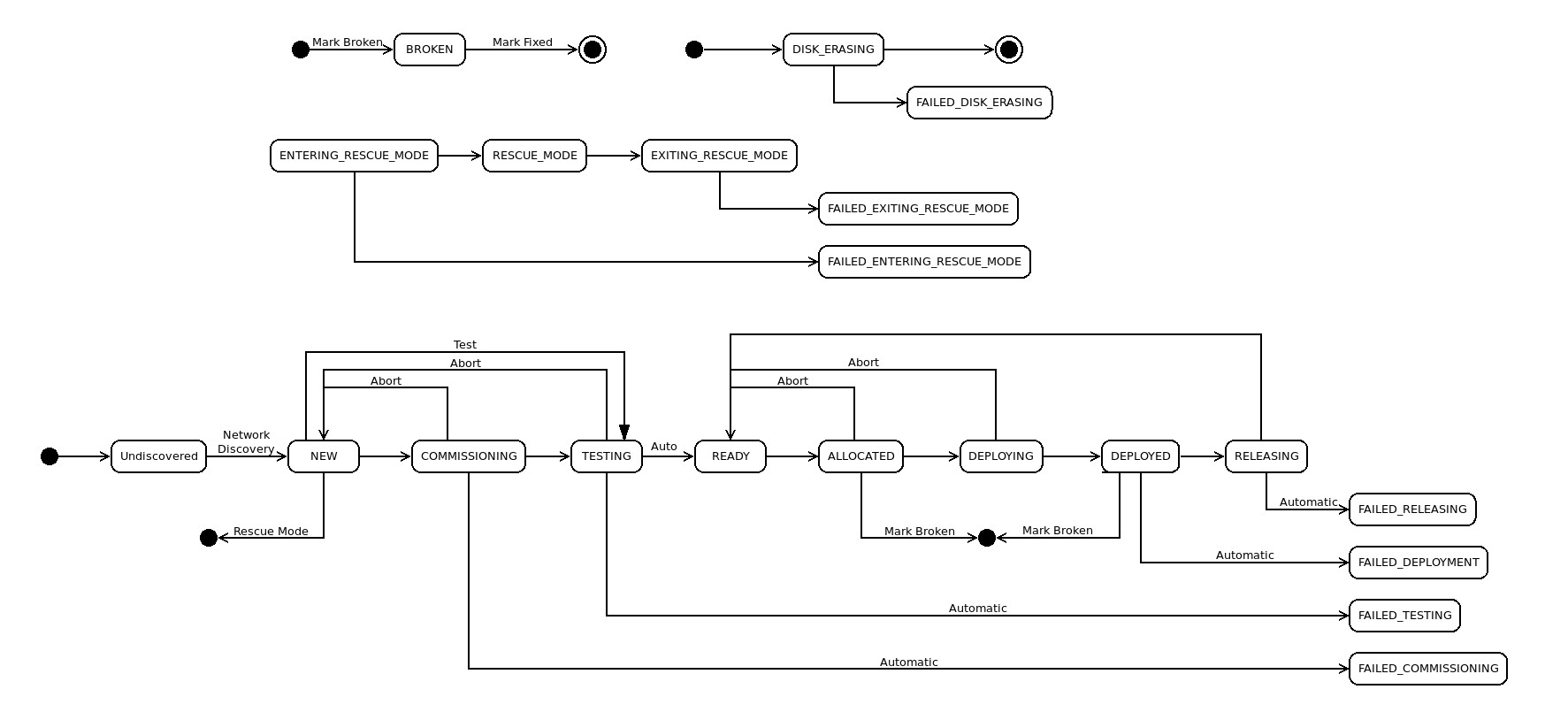 There is one more state that a machine can get into: “failed”. This state is entered when commissioning, allocation, or deployment are not successful. Getting out of a failed state means figuring out what went wrong, correcting it, and retrying the failed operation. For example, when a machine fails, you can try and commission it again, hopefully after you’ve found the bug in your custom commissioning script that’s causing it to fail (for instance).