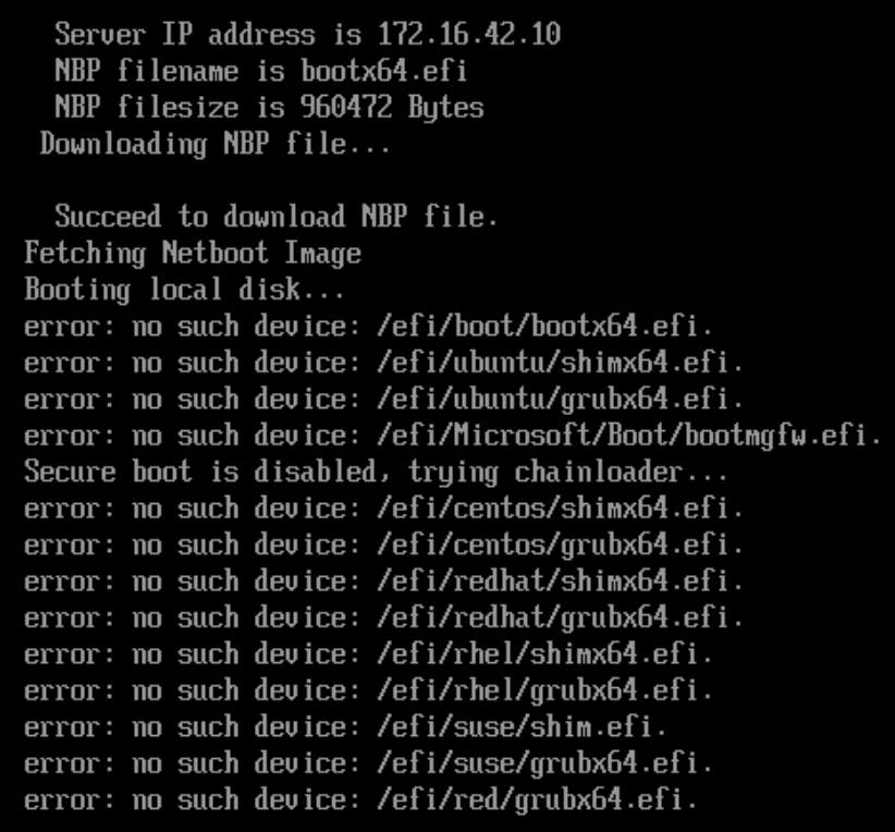 The UEFI firmware will show it can’t find the /efi/... files but the hint is that it’s not complaining about missing files but “no device found”. The mention of “device” should redirect the troubleshooting to the physical disks and not to the filesystem, PXE or boot options. It took me a while to realize this because I was focused on the filenames it was complaining about and sometimes I would reboot the server and the issue wasn’t present… just to happen again in the next reboot.